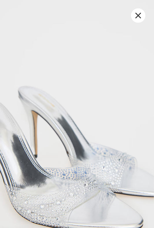 Silver Pu Point Toe Diamante Strap Heeled Mules
